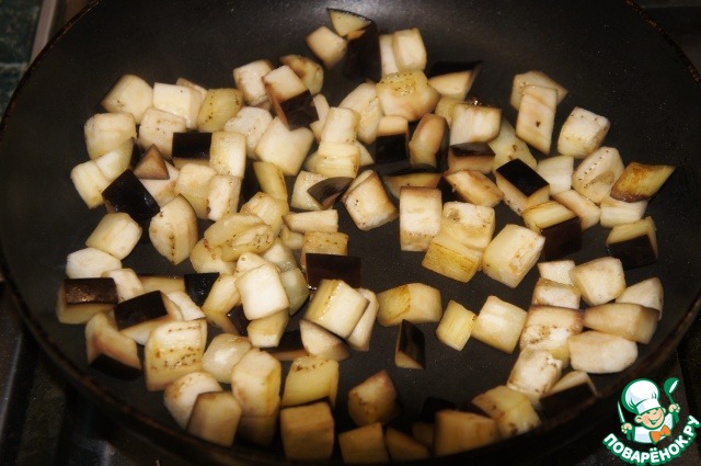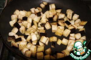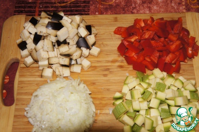 Оба перца очистить от семян. Сладкий перец, баклажан и кабачок нарезать небольшими кубиками. Лук измельчить.