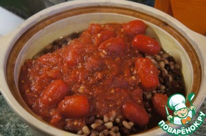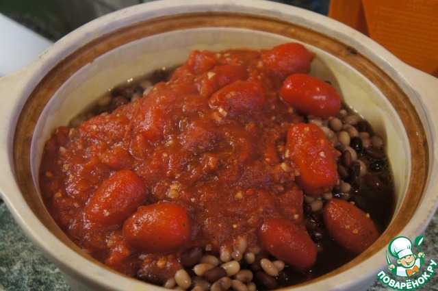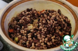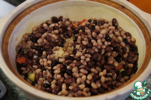 Готовые овощи перекладывать в большую жаропрочную форму или кастрюлю. Туда же добавить всю фасоль вместе с 2-мя стаканами жидкости, в которой она варилась.