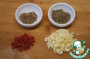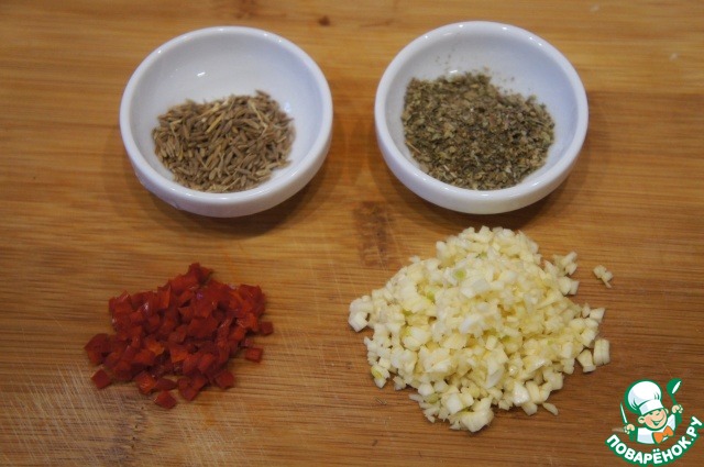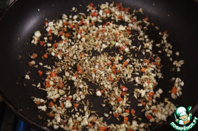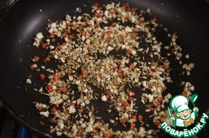 Всыпать в сковороду чеснок, зиру, орегано и чили и готовить 30 секунд,