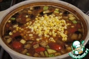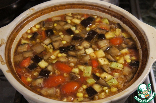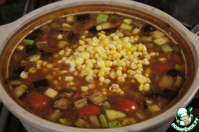 Добавить кукурузу. Приправить солью и перцем, плотно закрыть крышкой или фольгой и поставить в разогретую до 180*С духовку на 50-60 минут.