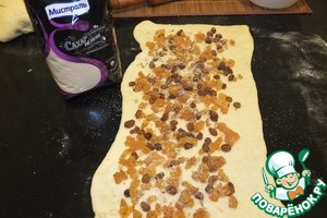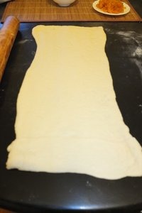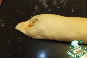Раскатываем тесто длинной узкой полоской, смазываем его растительным маслом.