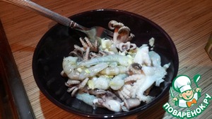 Креветки у меня серые, вареные заранее не люблю - вкус не тот. Мини-осьминоги и один большой кальмар. -