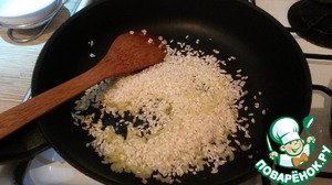 Лук мелко порежем, отправим на сковороду со столовой ложкой оливкового масла. Обжарить слегка до прозрачности. Далее добавим весь рис. Обжарим пару минут, помешивая.