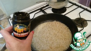 Когда примерно половина бульона уйдет, добавим в ризотто половину баночки чернил каракатицы (50 мл). Перемешаем, вольем очередную порцию бульона и продолжим готовить как до этого.