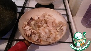 Тем временем разогреем на соседней конфорке сковороду. Отправим на нее наши морепродукты буквально на пару минут (им больше и не надо - мы же хотим их вкусными, мягкими, а не резиновыми).