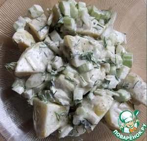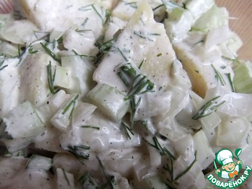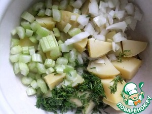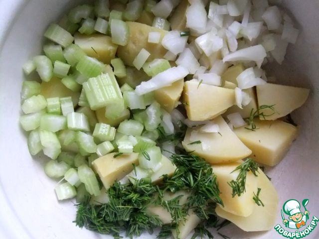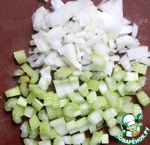 Добавить лук и сельдерей. Туда же положить нарезанный укроп.