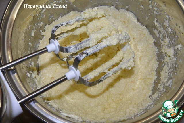 Муку просеять и, смешав с разрыхлителем, всыпать в тесто.