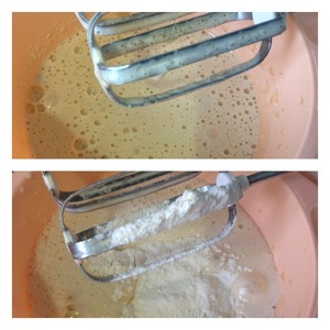 Далее разрыхлитель и мука, взбиваем. Делим тесто на 2 части. -