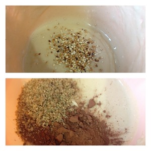 Чашу МВ смазать маслом и выложить темное тесто, сверху очень аккуратно выкладываем белое тесто