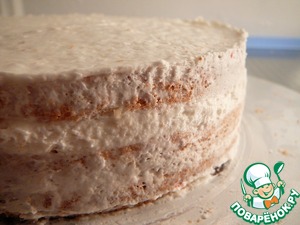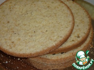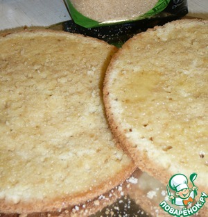 Часть еще теплого соуса мы используем для пропитки коржей (не более половины порции соуса на все). Если любите очень "мокрый" бисквит, доведите его до нужной кондиции молоком или водой.