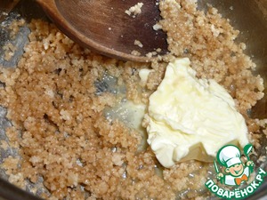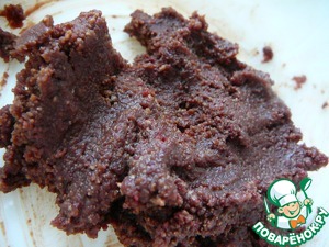 В это время размалываем орехи, смешиваем крошку с мягким шоколадом и маслом. Растираем массу до однородности.