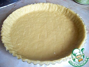 Теперь формируем корж. Тесто придавить к форме, обрезать лишнее лопаткой. Вилкой наколоть тесто по всему диаметру, только не насквозь. Накалываем для того, что бы тесто не вздувалось.