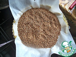 Накрываем тесто пергаментом, засыпаем "грузом". (можно использовать горох, фасоль, но я взяла гречку) "Груз" для того, что бы тесто не вздувалось. Выпекаем тесто в разогретой духовке на 200 градусов, 10-15 минут.