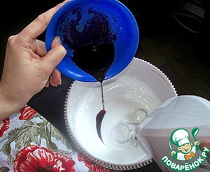 Крем взбиваем до густого состояния, добавляем выпаренный вишневый сок (выпаривание:сок вылить в металлическую миску, поставить на огонь, кипятить до состояния жидкого концентрированного сиропа)