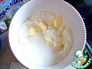 Муку, холодное сливочное масло (порезанное кубиками), сахар, сметану, соль перебить миксером, на первой скорости. (или перетереть вилкой)