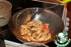 Берем сковороду Вог наливаем кунжутное масло и сильно раскаляем. Затем небольшими порциями выкладываем курицу и обжариваем минут 5-7.