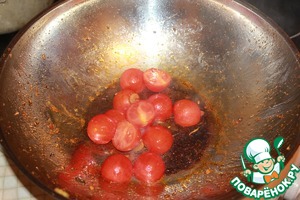 На этом же масле обжариваем порезанные пополам Помидорчики черри и выкладываем к курице.