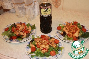 . Пока курица обжаривается на тарелку выкладываем микс салата, когда курица готова выкладываем на салат.
