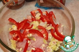 Затем порезать болгарский перец, сельдерей, корень имбиря, чеснок, стебель лемонграсса. Смешать с курицей.