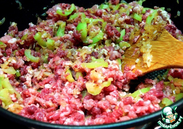 Добавьте чили, готовьте с луком минуту. Затем добавьте сладкий перец, порезанный небольшими кусочками. Готовьте еще минуту.