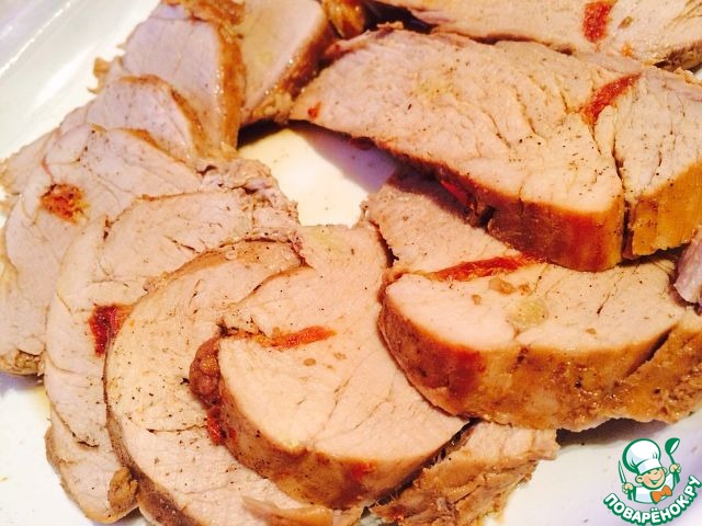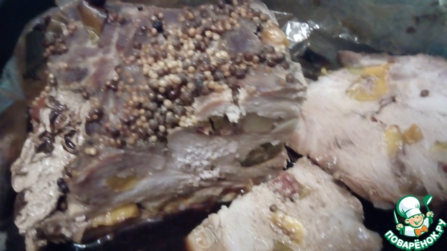 Так как у меня было много "проколов" и овощей, то, чтобы кусок мяса был более компактным и не расползался, связала его нитками.