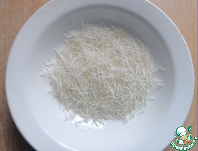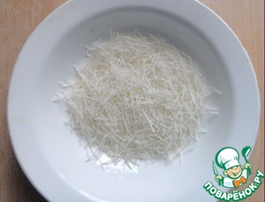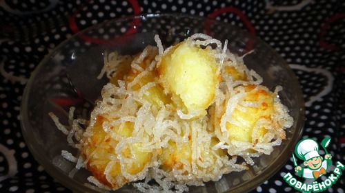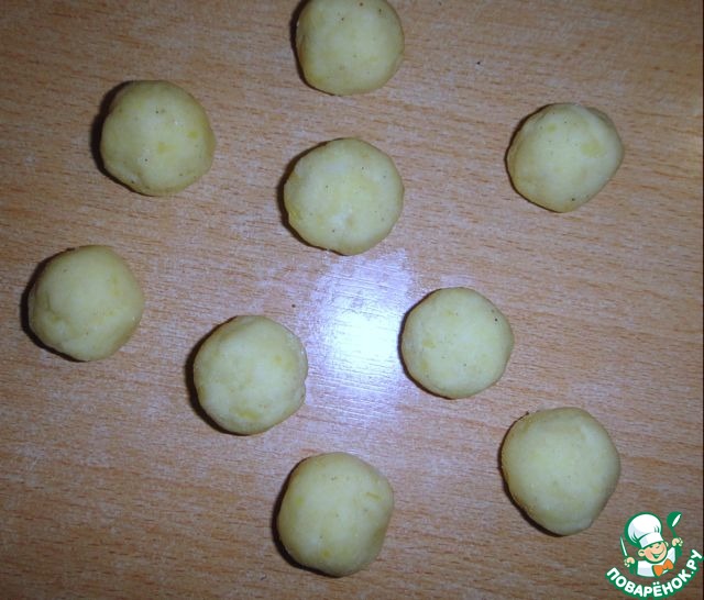 Из картофельного теста влажными руками сформовать шарики величиной с грецкий орех, обвалять их в вермишели, плотно прижимая.
