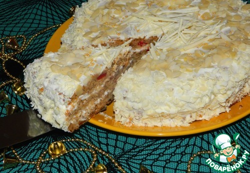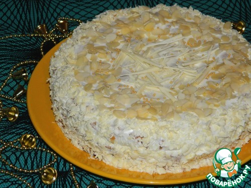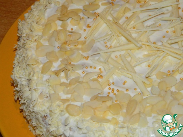 Готовый торт украшаем белым шоколадом и миндальными хлопьями. И убираем на несколько часов в холод для пропитки!