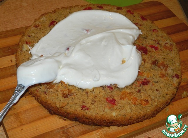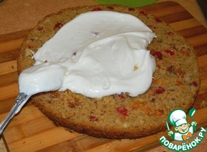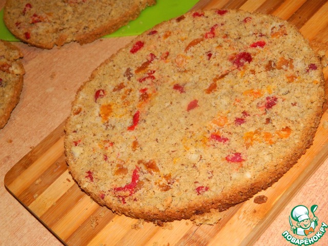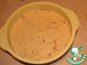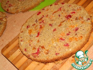 Всыпаем измельченные орехи и сухофрукты. Готовое тесто выкладываем в смазанную маслом форму, разравниваем. Выпекаем при 180 С минут 40.
