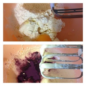 • Для начинки взбить тщательно творог, сахар, яйцо и пудинг. Добавить краситель и немного взбить