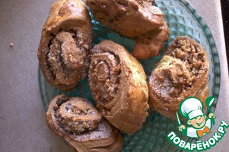 Ингредиенты: Кефир Маргарин Мука пшеничная Сода Соль Орехи грецкие Сахар Желток яичный Масло растительное