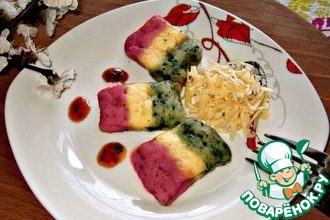 Ньокки - это итальянские клецки, обычно овальной формы. Но мои ньокки не обычные, они символизируют флаг Италии. Зеленый цвет выступает в качестве символа веры, белый означает надежду, а красный – любовь.