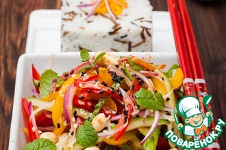 Перец болгарский Огурец Лук красный Арахис Мята Кунжут Сок лимонный Мед Соевый соус Перец чили Масло оливковое Рис