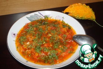 Хочу предложить Вашему вниманию вкусную, легкую овощную похлебку с Момордикой. Время приготовления не больше 15 минут. Не встретила на сайте ни одного рецепта с Момордикой, а ведь это редкий, но очень полезный овощ. Мы выращиваем его в своем саду уже несколько лет. Сначала выращивали как декоративное растение, уж очень у неё яркие, красивые плоды на сочных зеленых лианах. но когда я узнала о пользе Момордики, стали употреблять её в пищу, в разных кулинарных вариантах, один из которых хочу Вам показать. Интересно? Заходите)