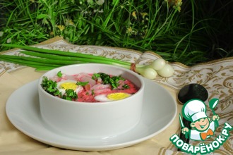 Свекла Огурец Яйцо куриное Яйцо перепелиное Балык Филе куриное Соевый соус Чеснок Лук зеленый Укроп Петрушка Вода Соль Сахар Перец черный Перец красный жгучий Сметана Бальзамик Хрен