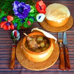 Мясо содержит много полноценного животного белка, в состав которого входят необходимые организму аминокислоты. Но многие виды мяса содержат и достаточно большое количество жира. По своим диетическим качествам лидером считается мясо кролика – в нем всего 11 процентов жира. Поэтому даже если вы на диете, предварительная быстрая обжарка кролика не будет вредной. Запеченный в горшочке с томатным соусом и красным вином кролик получается очень нежным и сочным. Хлебная крышечка используется главным образом для того, чтобы из горшочка не выходил пар.