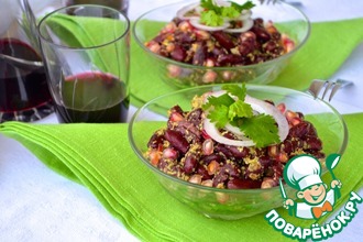 Салат из фасоли с песто из кинзы и грецких орехов. Этот салат полон витаминов, которыми нам необходимо наполнить организм до зимы. Красная фасоль является чрезвычайно полезным продуктом. Регулярное употребление ее в пищу позволяет укрепить иммунитет человека, улучшить состояние нервной системы и внешний вид кожи. А орехи обеспечивают многие необходимые витамины и минеральные вещества. Древнегреческий историк Геродот писал, что грецкие орехи наделены особой жизненной силой. Так что польза этого блюда очевидна. Кроме того, салат очень вкусный, сытный и простой в приготовлении.