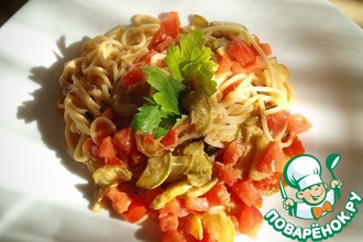 Весной организм испытывает дефицит витаминов. Чтобы его восполнить, надо включать в рацион больше овощей и трав. Даже привычные блюда можно немного модернизировать, если ввести в них зеленные овощи. Даже если они замороженные. В них в большей степени, чем в свежих сохраняются такие ценные для здоровья вещества, как кверцетин, имеющий противовирусное действие, сульфорафан, предотвращающий онкологические заболевания и полиацетилены, стимулирующие регенерацию клеток. Поэтому я, не мудрствуя лукаво, взяла замороженные овощи и зелень и сделала с ними лапшу собственного приготовления. На гарнир добавила ещё солидный кусочек свежего цуккини и подала их к очень вкусному кусочку свежей лососины. Получилось лучше, чем в ресторане. Посмотрите... жаль, что не могу вас всех пригласить в гости, чтобы насладится блюдом, которое я сегодня придумала, приготовила и сфотографировала, чтобы вы могли убедиться, что это просто. А то, что это было вкусно, поверьте на слово.