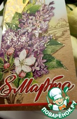 В этом году перед 8 марта я получила замечательный сюрприз – открытку ручной работы от замечательной, талантливой и артистичной девушки, моей подруги Ольги Данциной. Открытка очень красивая и оригинально сделанная – она связана бантиками. Рисунок нежнейший, сделан, если я не ошибаюсь, акварельным карандашом, в нашей поваренковской теме. Оля, спасибо тебе огромное за такой душевный подарок и теплые слова. Ты сделала этот праздник еще ярче для меня.