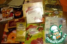 А ещё большое количество шоколада, финики, кокосовая стружка, для Илюшки-карандашики, коробочка для свечек и очень милая открытка