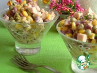 Простой и сытный салат с фасолью, горошком, кукурузой и копченой куриной грудкой! Приготовление салата не займет много времени и станет хорошим дополнением к обеду или ужину!
