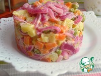 Идею этого салат присмотрела на польском кулинарном форуме. Салат из простого набора овощей и зеленого горошка. А яркий акцент в этом салате - красный лук, приготовленный в маринаде!
