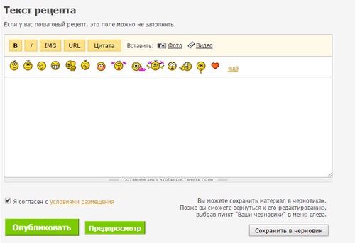 12. Технологию приготовления рецепта без пошаговых инструкций описываем в поле «Текст рецепта», нажимаем «Опубликовать» или «Сохранить в черновик».