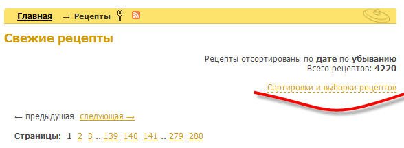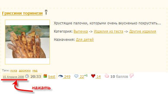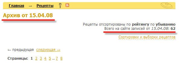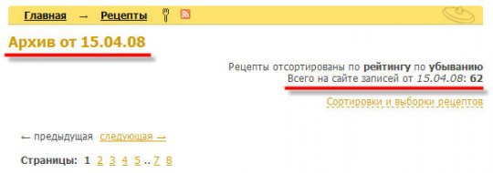 Также можно воспользоваться просмотром рецептов по дате. У каждого рецепта есть дата размещения в левом нижнем углу "окошка рецепта", нажав на которую, вы попадете в архив рецептов за указанную дату.