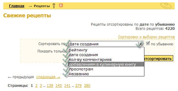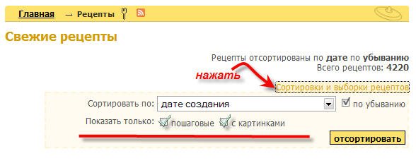 Для удобства пользования каталога рецептов можно воспользоваться сортировщиком. Расположен он на странице рецептов. Вам предлагается несколько вариантов сортировки рецептов. Для сортировки обозначьте желаемые галочки и выберите нужный пункт из раскрывающегося меню, после чего нажмите кнопку "отсортировать".