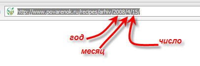 Также можно воспользоваться простой ссылкой на архив рецептов за определенный день - https://www.povarenok.ru/recipes/arhiv/ГОД/МЕСЯЦ/ДАТА/ , указав желаемый год, месяц и дату размещенного рецепта.