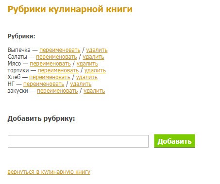 Кулинарная книга – это такая книга, в которую каждый пользователь может сохранять понравившиеся ему рецепты других кулинаров. Она подразделяется на рубрики, которые Вы сами можете создавать для удобства пользования, отслеживать общее количество добавленных рецептов, а также в отдельно созданных рубриках.